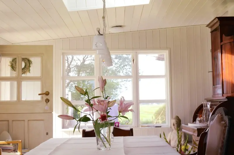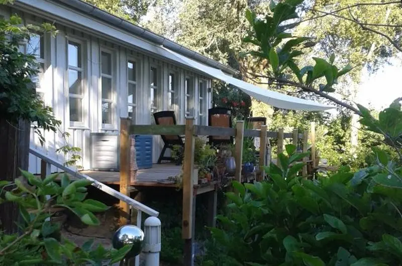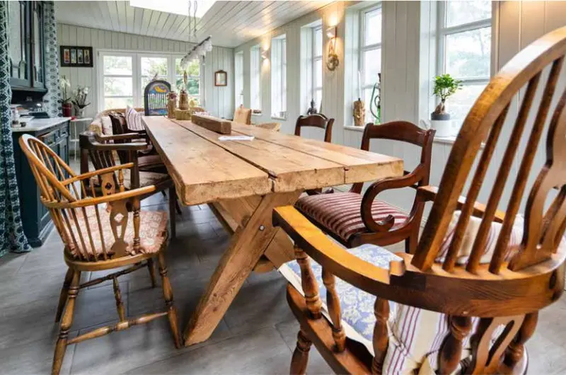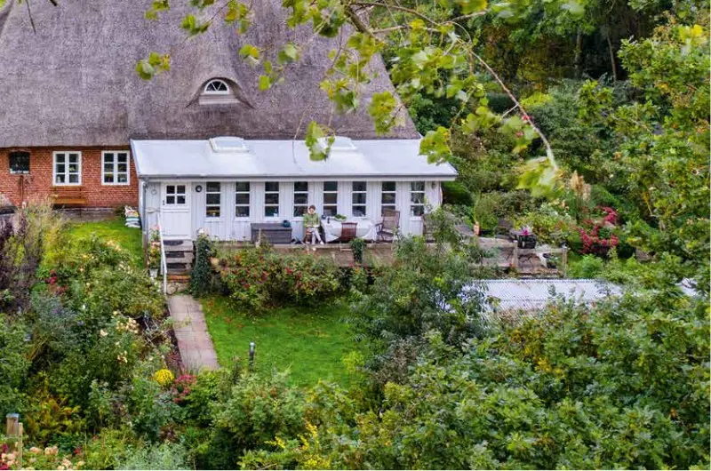 Zusammenkommen können die Gäste entweder im gemütlichen Wintergarten im Erdgeschoss, dessen Mittelpunkt ein fast vier Meter langer handgefertigter Tisch aus alten Holzbohlen bildet, oder auf der Terrasse und im Garten.